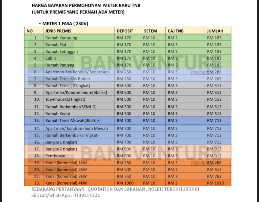 Berapa Caj Harga Untuk Masuk Meter TNB ? METER 1 FASA ( 230V)